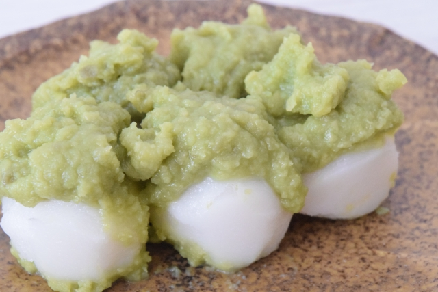 うぐいすあんと同じ緑色をしているが、枝豆を使っているものはずんだあん。宮城県や山形県の名産品のずんだ餅が有名